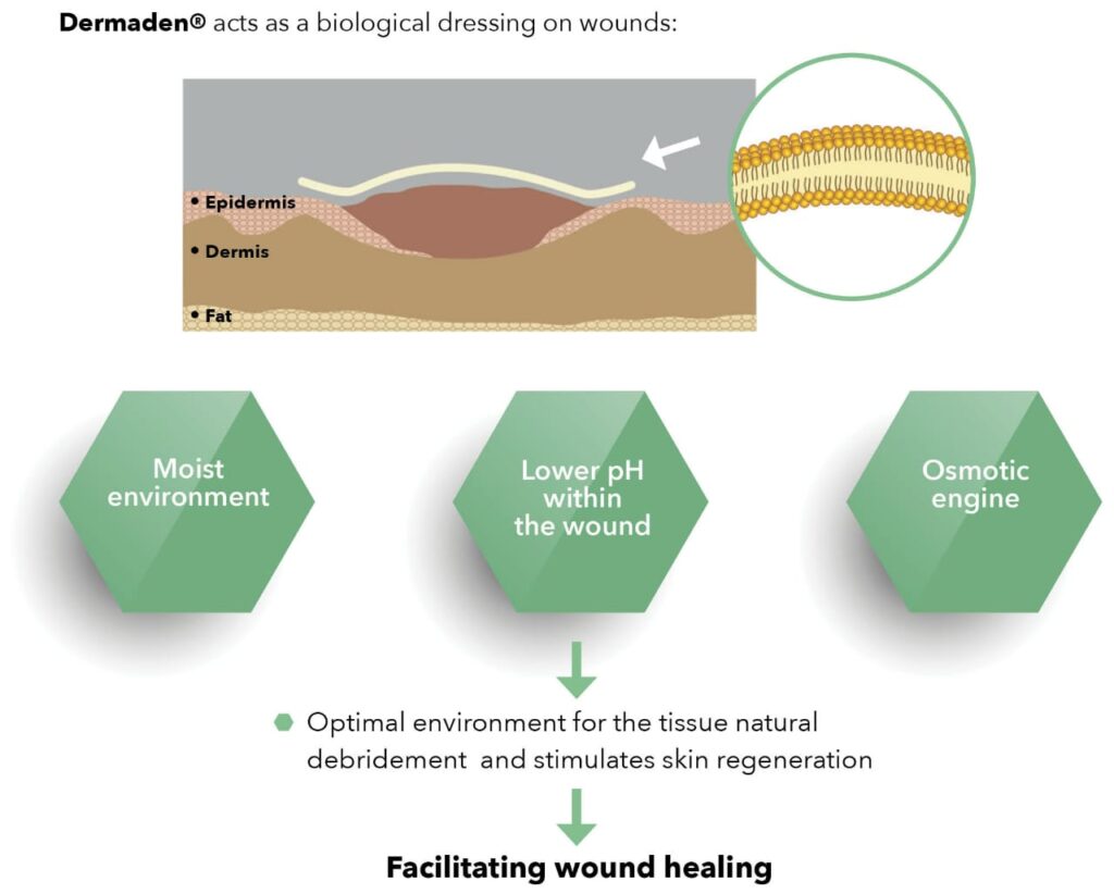 Dermaden– A novel biological dressing with demonstrated clinical efficacy (3) for wound management (1).